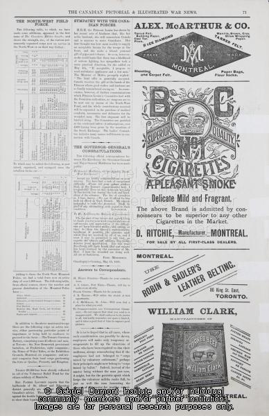 | Description: | On this page, (pg. 34, The Canadian Pictorial & Illustrated War News, date unknown), correspondents write about events that took place during the 1885 Resistance including information on the troop strength of the North-West Field Force, Princess Louise’s sympathy for the Canadian troops and the Governor-General’s congratulations to Major-General Middleton for suppressing the resistance. Of note on this page are advertisements that delineate late nineteenth-century tastes.