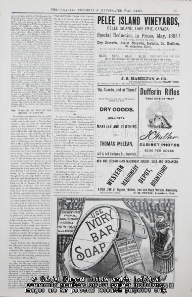 Description: On this page, (pg. 79, The Canadian Pictorial & Illustrated War News, date unknown), correspondents write about events that took place during the 1885 Resistance including the funeral of two Canadian soldiers killed during the Battle of Batoche (May 9-12, 1885) and various vignettes taken from the battlefield including troop deployment. Of note on this page are advertisements that delineate late nineteenth-century tastes.