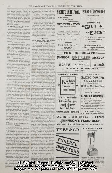 | Description: | On this page, (pg. 62, The Canadian Pictorial & Illustrated War News, date unknown), correspondents write about events that took place during the 1885 Resistance including information about how Louis Riel can be tied “for his crimes”, in addition to descriptions of illustrations that appear in this collection. Of note on this page are advertisements that delineate late nineteenth-century tastes. |