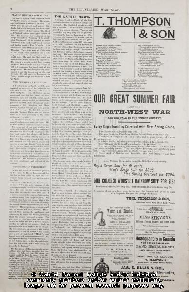 | Description: | On this page, (pg. 6, The Canadian Pictorial & Illustrated War News, date unknown), correspondents write about events that took place during the 1885 Resistance including exaggerated estimates about the size of Métis forces at Batoche (1,500-2,000), the possibility of a general Aboriginal uprising in Western Canada (which was much exaggerated) and a report of a debate that took place in Parliament about why Louis Riel came to Canada and his true intentions. From a Métis perspective, this debate is interesting because it was Sir John A. Macdonald’s opinion that Louis Riel came to Canada not out of altruism but to take money from the public purse. The right-wing scholar Thomas Flanagan used this debate between Macdonald and former Liberal leader Edward Blake to discredit Louis Riel and to dismiss the Métis resistance. Of note on this page are advertisements that delineate late nineteenth-century tastes. |
