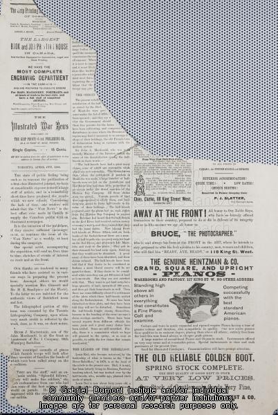 Description: On this damaged page, (The Canadian Pictorial & Illustrated War News, date and page unknown), correspondents write about events that took place during the 1885 Resistance including information about Louis Riel. The paper describes Louis Riel as “… about forty years old, a medium height, stout and dark complexioned, with dark brown hair and moustache. He has a well shaped and somewhat massive forehead, a Roman nose. His eyes are dark…” Of note on this page are advertisements that delineate late nineteenth-century tastes.