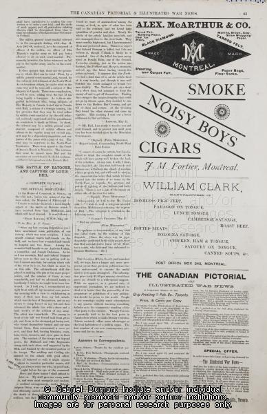 Description: On this page, (pg. 68, The Canadian Pictorial & Illustrated War News, date unknown), correspondents write about events that took place during the 1885 Resistance including the conclusion of the Battle of Batoche and the capture of Louis Riel. This page contains the official dispatches of General Middleton to the Minister of the Militia and Defence, Adolphe Caron. There is also a discussion that Louis Riel, a naturalized American citizen, could still be tried for treason. One passage shows Middlelton’s assessment of the fall of Batoche – which shows the prejudices of a nineteenth-century British general: “I cannot of course be certain, but I am inclined to think the complete smash of the rebels will have pretty well broken the back of the rebellion. At any rate, it will, I trust, have dispelled the idea that half-breeds and Indians can withstand the attack of resolute whites properly led…” Of note on this page are advertisements that delineate late nineteenth-century tastes.