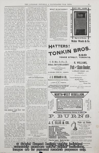 | Description: | On this page, (pg. 51, The Canadian Pictorial & Illustrated War News, date unknown), correspondents write about events that took place during the 1885 Resistance including an account of the Battle of Duck Lake (March 26, 1885) and the Battle of Fish Creek (April 24, 1885), as well as supporting information for some of the illustrations that appear in this collection. Of note on this page are advertisements that delineate late nineteenth-century tastes. |