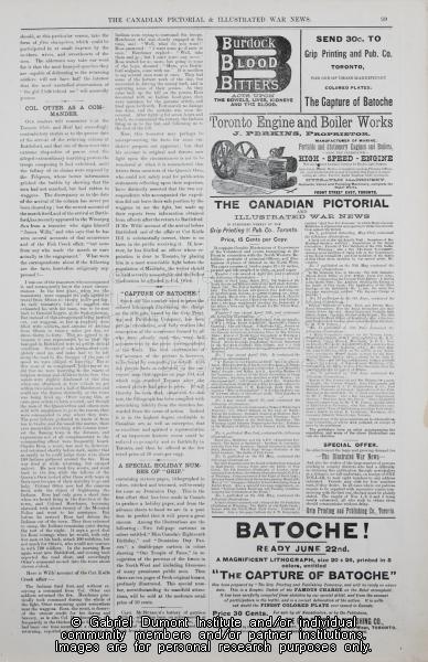 Description: On this page, (pg. 99, The Canadian Pictorial & Illustrated War News, date unknown), correspondents write about events that took place during the 1885 Resistance including information about Colonel Otter’s leadership, information about the Battle of Cut Knife Creek (May 2, 1885), as well as the fall of Batoche. Of note on this page are advertisements that delineate late nineteenth-century tastes.