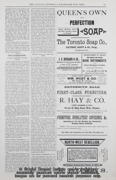 Description: On this page, (pg. 83, The Canadian Pictorial & Illustrated War News, no date), correspondents write about events that took place during the 1885 Resistance including information about the campaign to award a Victory Cross to The Canadian Pictorial & Illustrated War News illustrator Colonel-Sergeant F, W, Curzon, the popularity of Major-General Frederick Middleton, and the 62nd Battalion from Fredericton, New Brunswick and Camp Denison (in what is now Humboldt, Saskatchewan). The text on this page is contextual information for several images that appear in this collection. Of note on this page are advertisements that delineate late nineteenth-century tastes.