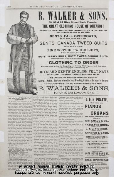 | Description: | On this page, (pg. 150, The Canadian Pictorial & Illustrated War News, no date), correspondents write about the celebrations in Montréal following the conclusion of the 1885 Resistance. Of note on this page are advertisements that delineate late nineteenth-century tastes. |