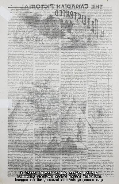 | Description: | On this page, (pg. 110, The Canadian Pictorial & Illustrated War News, no date), correspondents write about events that took place during the 1885 Resistance including information about the situations of Métis refugees at Fort Pitt, Riel’s imprisonment, White Cap’s Band and their captors, as well information about the experiences of Canada’s soldiers. Of particular note is Nicolas Flood Davin’s account of Louis Riel in captivity: “…he is perfectly rational and maintains that he only fought for the rights of half-breeds and is not a rebel – the half-breeds never having acknowledged the Dominion Government”. The text on this page is contextual information for several images that appear in this collection. |