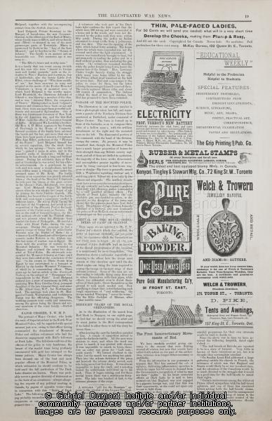 | Description: | On these pages (pg. 18-19, The Canadian Pictorial & Illustrated War News, April 18, 1885), correspondents write about events that took place during the 1885 Resistance including information about the arrival of the Royal Grenadiers at Camp Desolation, the movements of the Royal Grenadiers, and Louis Riel’s attempts to garner the support of Euro-Canadian farmers at the start of the 1885 Resistance. Of note on these pages are advertisements that delineate late nineteenth-century tastes. |