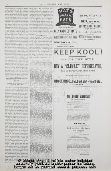 | Description: | On these pages (pgs. 14-15, The Canadian Pictorial & Illustrated War News, no date), correspondents write about events that took place during the 1885 Resistance including information about the execution of Thomas Scott by a Métis tribunal during the Red River Resistance, information, a discussion of Lieutenant Howard and the Gatlin Gun, as well as fiction, poetry and a discussion of different kinds of noses. Of note on these pages are advertisements that delineate late nineteenth-century tastes.