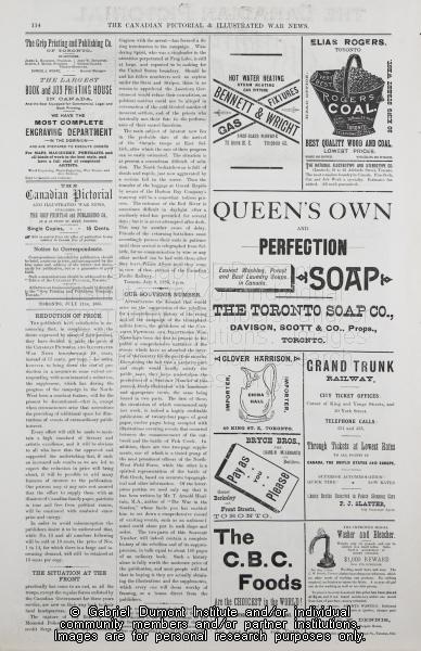 | Description: | On these pages (pgs. 114-115, The Canadian Pictorial & Illustrated War News, July 11, 1885), correspondents write about events that took place during the 1885 Resistance including information about the capture of Big Bear and Miserable Man and others, French Canadians support of Louis Riel and concern for the Métis’ plight, the death of Colonel Williams, the reorganization of the North-West Mounted Police, and the lack of Catholic Sacraments for the Métis prisoners in the Regina prison. In one instance, the Métis are actually referred to as “Métis” rather than the usual “Half-breed” or “rebels”. There is also information about the capture of Miserable Man and other “bad” Indians – who were described this way in response to the killings at Frog Lake (April 2, 1885). Of note on these pages are advertisements that delineate late nineteenth-century. |