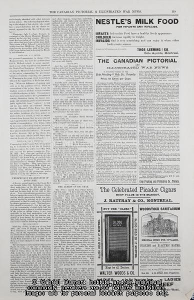 Description: On these pages (pgs. 118-119, The Canadian Pictorial & Illustrated War News, no date), correspondents write about events that took place during the 1885 Resistance including information about the attack of the North-West Mounted Police on Big Bear’s Band, the 91st Battalion, the Steamer Marquis, military views of Battleford, Lieutenant Colonel van Straubenzee, Captain Stewart, Major am Steele, Lieutenant-Colonel Irvine, Lieutenant Turnball, Louis Riel and Big Bear. The most interesting text in this section refers to the wording of the treason charged levied against Louis Riel who was according to the charge “seduced by the instigation of the Devil, as a false traitor against our said Lady the Queen”. Of note on these pages are advertisements that delineate late nineteenth-century.