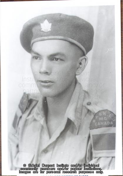 Photograph of Charlie Umpherville in military uniform. Charlieʼs story can be found in "Remembrances: Interviews With Metis Veterans". To purchase Métis Veterans: Remembrances please visit: GDIʼs E-commerce Site. |