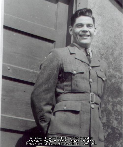 | Description: | Photograph of Leo Pruden taken in Dundurn, SK. Leo joined the service June 14th, 1941 in Wynyard. Leoʼs story can be found in "Remembrances: Interviews With Metis Veterans". To purchase Métis Veterans: Remembrances please visit: GDIʼs E-commerce Site. |
