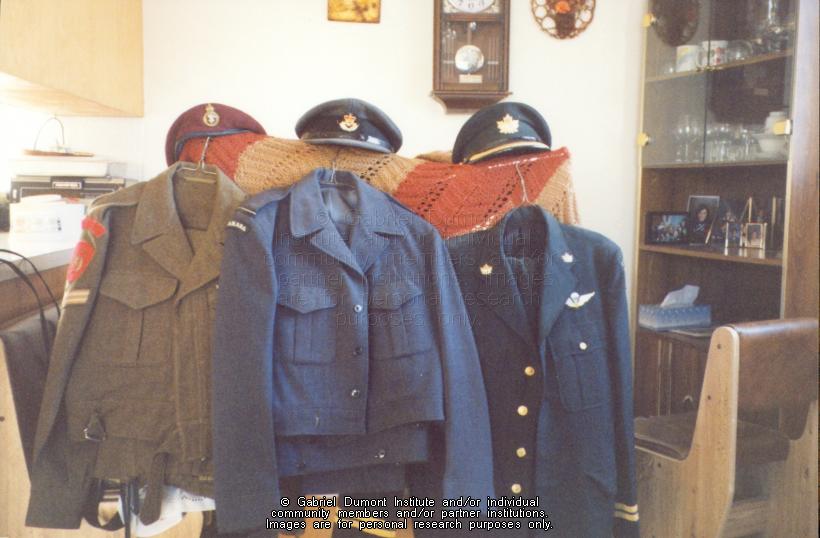 | Description: | Photograph of three uniforms belonging to Harold Ross, WW II. |
