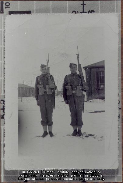 | Description: | Photograph of two soldiers standing outside holding guns. |