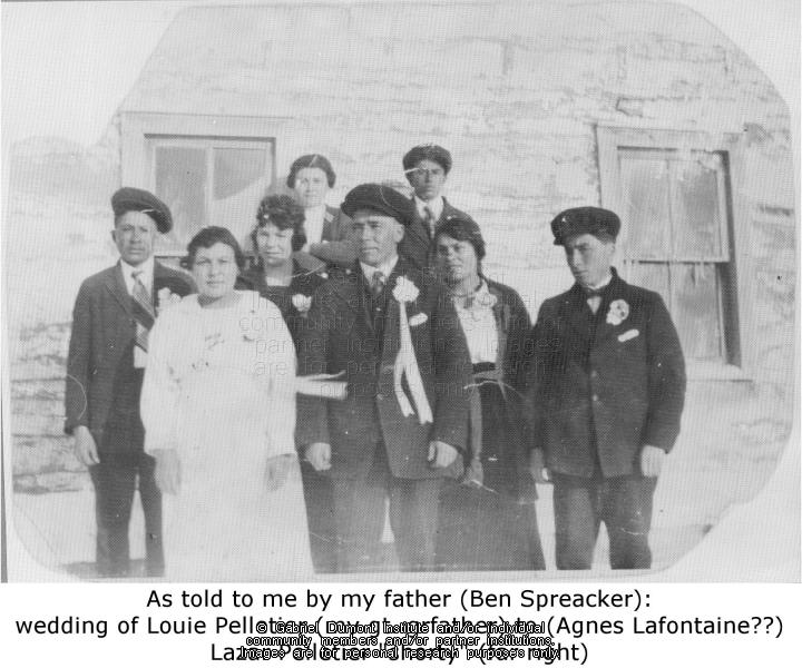 Wedding photo of Louie Pelletier and Agnes (née Lafontaine?). Lazar Pelletier (“Shorty) is on the far right. This image belongs to the Spreacker family. The Gabriel Dumont Institute is putting this image on this website on behalf of the Spreacker family. As such, the copyright for this image belongs to the Spreacker family. This image must not be reproduced. |