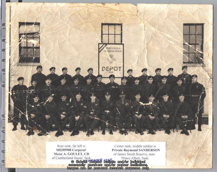 | Description: | Photograph of Corporal Moise A. Goulet of Cumberland House (rear rank, far left) and Private Raymond Sanderson of James Smith Reserve (center rank, middle soldier). Both men served in the Princess Patricia's Canadian Light Infantry. |