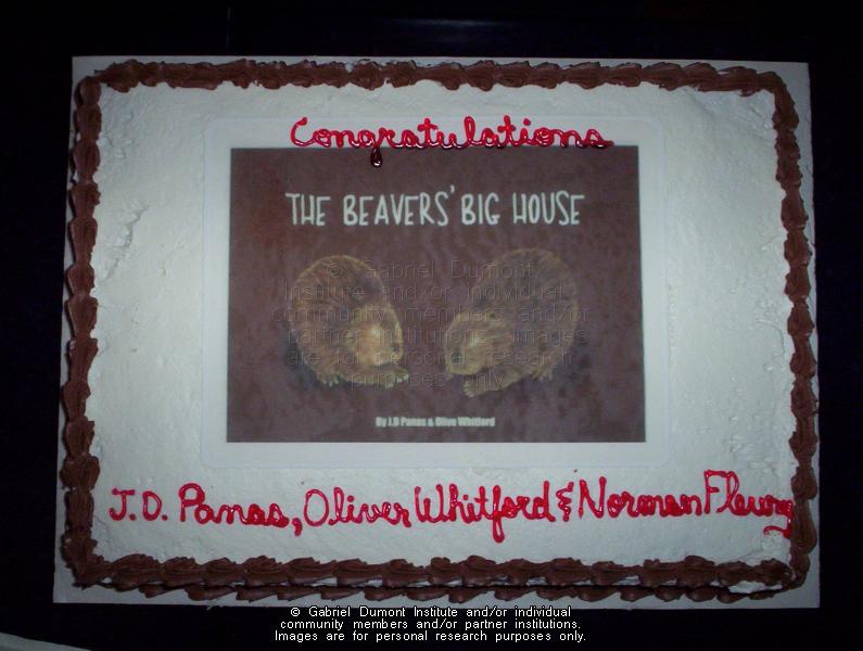 | Description: | Photograph of a cake celebrating the launch of The Beavers' Big House, at a book launch at McNally Robinson book store in Winnipeg, Manitoba, 2005. |