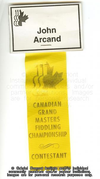 | Description: | John Arcand's Canadian Grand Masters Fiddling Championship Ribbon. |