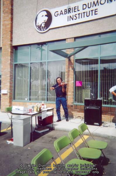 | Description: | Métis fiddler Henry Gardipy supplies musical entertainment at the grand opening of the new Gabriel Dumont Institute Saskatoon Office, Publishing Department and SUNTEP Central. This image is to be used for research purposes only. The reproduction of this image in whole or in part is strictly prohibited without the permission of the copyright holder. |