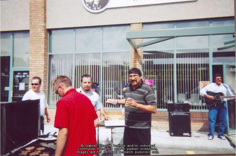 | Description: | Calvin Racette (facing right), then Executive Director of the Gabriel Dumont Institute, Joseph Fauchon (facing left), Métis author, and a Saskatoon SUNTEP student (preparing hamburgers) enjoy the grand opening of the new Gabriel Dumont Institute Saskatoon Office, Publishing Department and SUNTEP Central. This image is to be used for research purposes only. The reproduction of this image in whole or in part is strictly prohibited without the permission of the copyright holder. |