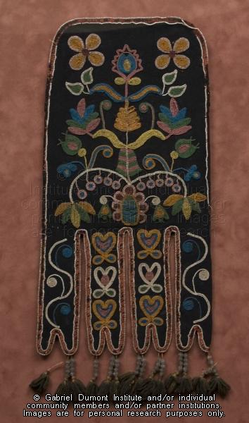 | Description: | Photograph of a beaded panel from an octopus bag - collected by Marius Barbeau. Wool stroud, glass and trade beads, silk ribbon, wool tassle. This item is part of the Gabriel Dumont Institute Museum Collection. |