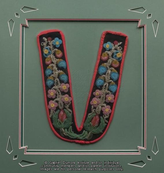Description: Photograph of a framed beaded yoke. This item is part of the Gabriel Dumont Institute Museum Collection.