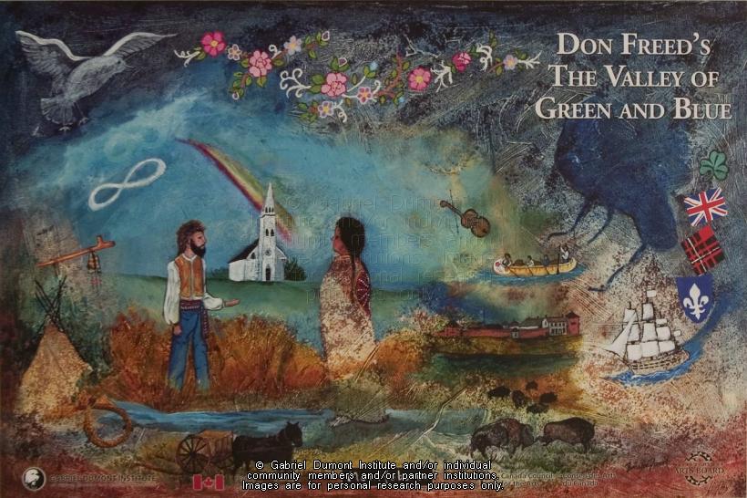 | Description: | Photograph of a poster by artist Donna Lee Dunont, designed to celebrate "The Valley of Green and Blue," a collection of songs by Don Freed, Métis singer/songwriter. To purchase Don Freedʼs "The Valley of Green and Blue" please visit: GDIʼs E-commerce Site. |