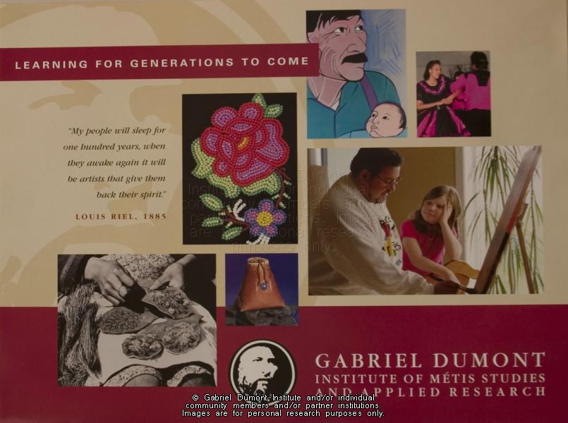 | Description: | Photograph of a poster. This poster is a tribute to how the arts have helped form Métis identity and culture. It is based on a quote attributed to Louis Riel. |