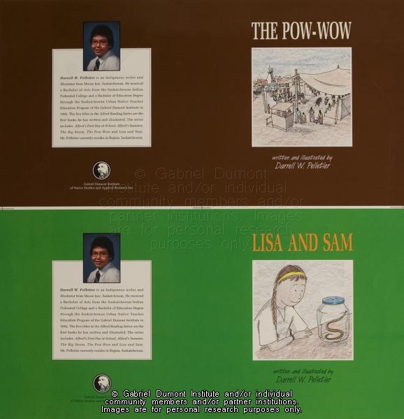Photograph of book covers for The Pow-Wow and Lisa and Sam. Written and illustrated by Darrell Pelletier, The Alfred Reading Series is an illustrated five book series for children in Michif, Plains Cree and French, with English subtitles. Through this set of storybooks, which focuses on Alfred and his sister Lisa, the reader will gain an appreciation of contemporary Aboriginal culture. The series includes: Alfred’s First Day at School, Alfred’s Summer, The Big Storm, The Pow Wow, and Lisa and Sam. |