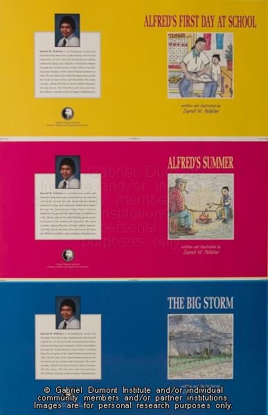Photograph of book covers for Alfred's First Day at School, Alfred's Summer, and The Big Storm. Written and illustrated by Darrell Pelletier, The Alfred Reading Series is an illustrated five book series for children in Michif, Plains Cree and French, with English subtitles. Through this set of storybooks, which focuses on Alfred and his sister Lisa, the reader will gain an appreciation of contemporary Aboriginal culture. The series includes: Alfred’s First Day at School, Alfred’s Summer, The Big Storm, The Pow Wow, and Lisa and Sam. |