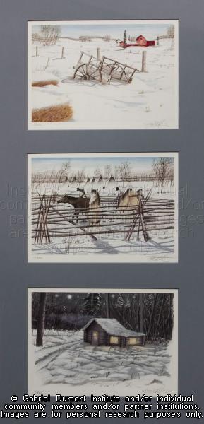 | Description: | Photograph of three paintings by Cree artist Gary Natomagan. This item is part of the Gabriel Dumont Institute Museum Collection. |