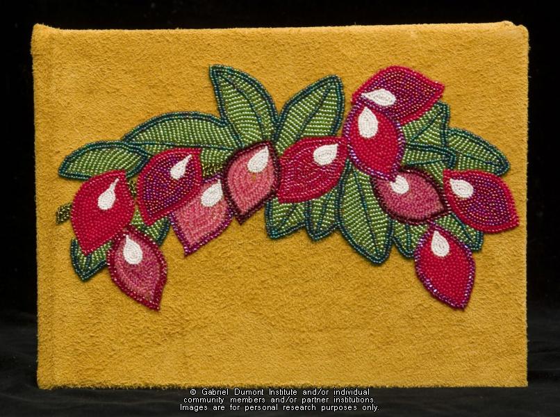 | Description: | Photograph of a beaded cherry blossom cover for a guest book by Métis/Cree artist Hilary Harper. This item is part of the Gabriel Dumont Institute Museum Collection. |