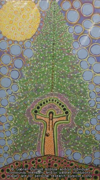 | Description: | Photograph of "The Great Tree of Peace Medicine," part of a series of paintings by Métis artist Leah Dorion. The series honours the female form and the strength of Aboriginal women and is titled "Medicine that Dances." This item is part of the Gabriel Dumont Institute Museum Collection. |