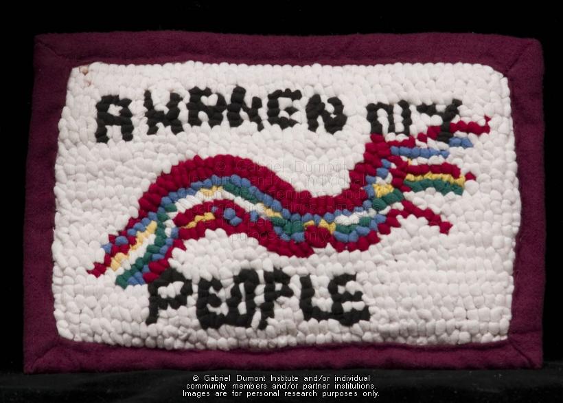 | Description: | Photograph of "Awaken My People" hooked rug by Margaret Harrison. This item is part of the Gabriel Dumont Institute Museum Collection. |