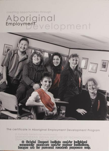 Photograph of a promotional poster advertising the Aboriginal Employment Development Program, offered jointly between the Dumont Technical Institute and the Saskatchewan Indian Institute of Technologies. |
