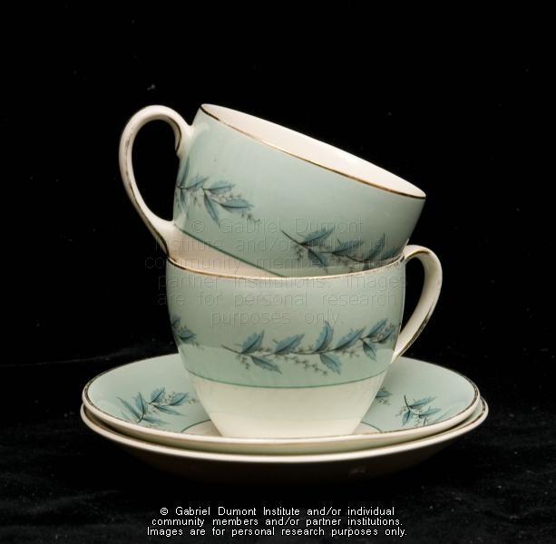Description: Photograph of teacups and saucers used as props for the Métis Folklore interviews.