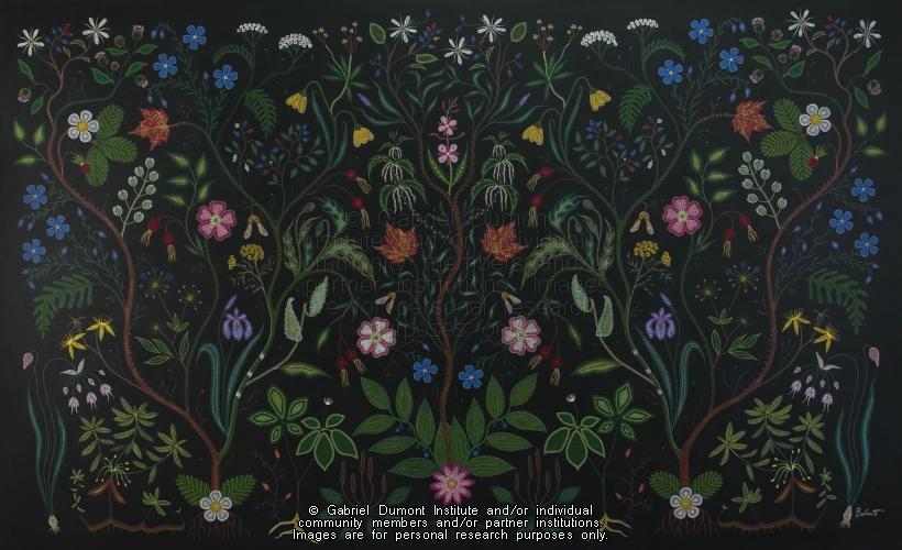 Photograph of “Medicines to Help Us,” created by Christi Belcourt in 2003. The painting is a manifestation of her prayers for all things in life to be in balance and in harmony. She includes plants throughout the different stages of their lifecycles, signifying their shortness and the inevitability of change. Christi's explanation for this work is that it is “…a painting for the Métis Nation. Each plant depicted is a type of wild plant that can be found in one or all provinces from Ontario to British Columbia. Some of the plants are indigenous to North America…and some are introduced species from Europe, but also have been used by Indigenous people for medicines…the medicines and plants in this painting are my prayers for the Métis Nation to encourage our healing…” This item is part of the Gabriel Dumont Institute Museum Collection. |