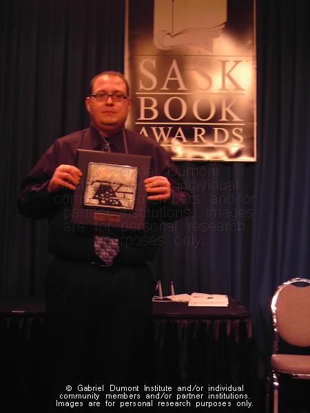 | Description: | Photograph of Darren R. Préfontaine, Curriculum Developer, Gabriel Dumont Institute, holding up the Saskatchewan Book Awards, First Peoples Publishing Award, which was presented to the Gabriel Dumont Institute for The Métis Alphabet Book, by Métis author Joseph Jean Fauchon. To purchase a copy of this resource please visit: GDIʼs E-commerce Site. |