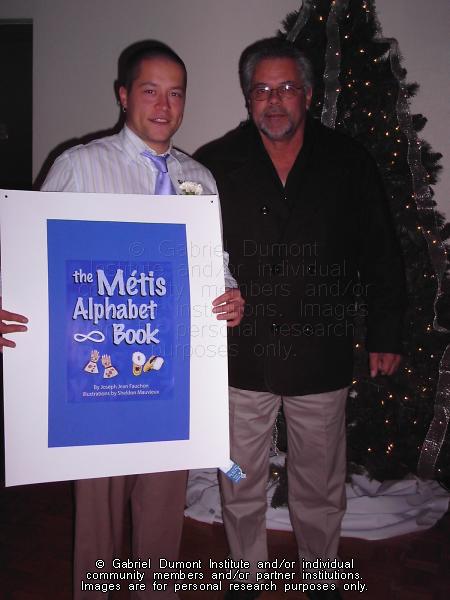 | Description: | Photograph of Sheldon Mauvieux, illustrator of The Métis Alphabet Book, and his father, at the 2006 Saskatchewan Book Awards in Regina, Saskatchewan. The Saskatchewan Book Awards, First Peoples Publishing Award, was presented to the Gabriel Dumont Institute for The Métis Alphabet Book, by Métis author Joseph Jean Fauchon. To purchase a copy of this resource please visit: GDIʼs E-commerce Site. |