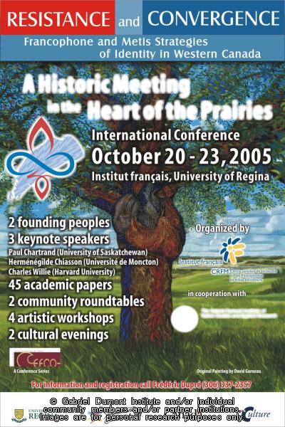 Poster advertising Resistance and Convergence: Francophone and Métis Strategies of Identity in Western Canada, an international conference held October 20-23, 2005, Regina, Saskatchewan. |