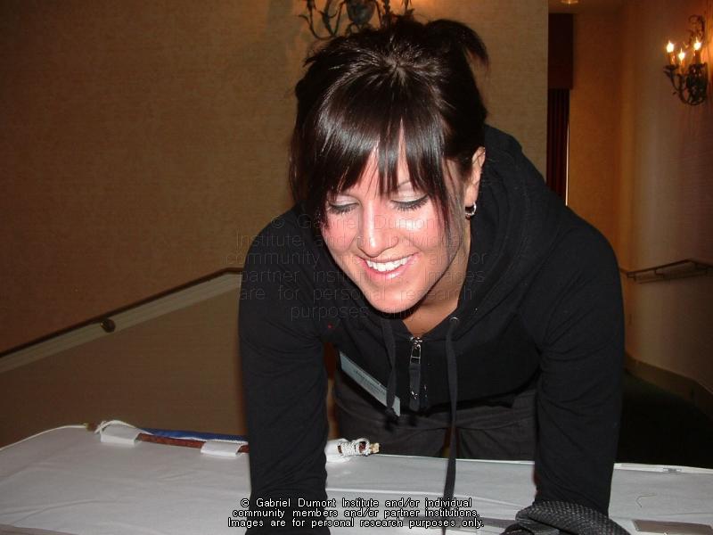 | Description: | Photograph of Janessa Temple, Curriculum Developer, Gabriel Dumont Institute, at the Michif Speakers Conference, March 11, 2006, Saskatoon, Saskatchewan. Delegates from Saskatchewan, Alberta and Manitoba gathered to form the National Michif Speakers Association (NMSA), which consists of Michif-speaking community people dedicated to the protection and promotion of the Michif-Cree language. |