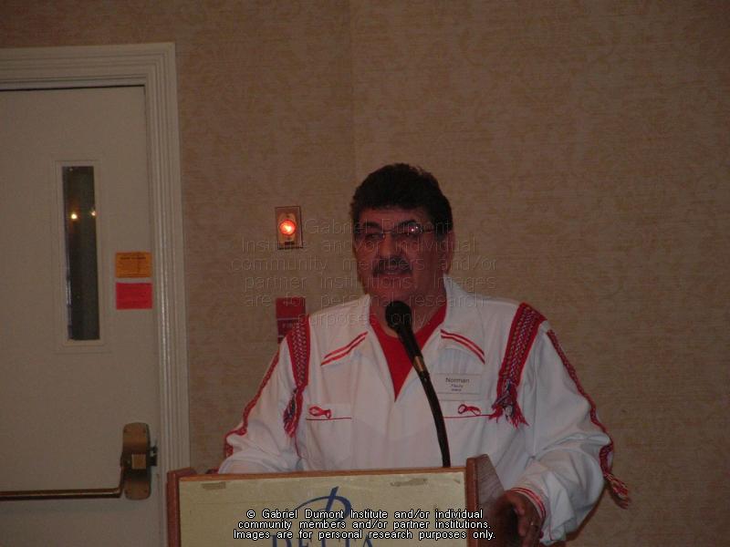| Description: | Photograph of Norman Fleury, Michif speaker from Virden, Manitoba, speaking at the Michif Speakers Conference, March 11, 2006, Saskatoon, Saskatchewan. Delegates from Saskatchewan, Alberta and Manitoba gathered to form the National Michif Speakers Association (NMSA), which consists of Michif-speaking community people dedicated to the protection and promotion of the Michif-Cree language. |