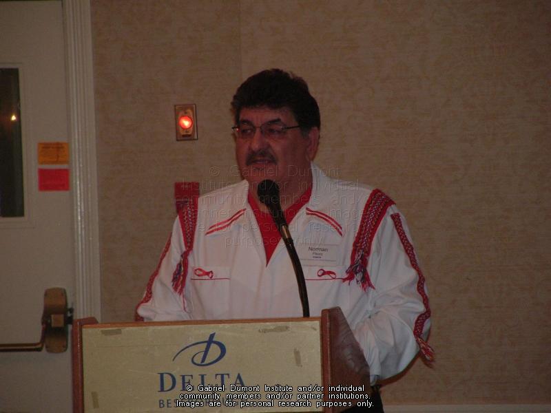 | Description: | Photograph of Norman Fleury, Michif speaker from Virden, Manitoba, speaking at the Michif Speakers Conference, March 11, 2006, Saskatoon, Saskatchewan. Delegates from Saskatchewan, Alberta and Manitoba gathered to form the National Michif Speakers Association (NMSA), which consists of Michif-speaking community people dedicated to the protection and promotion of the Michif-Cree language. |