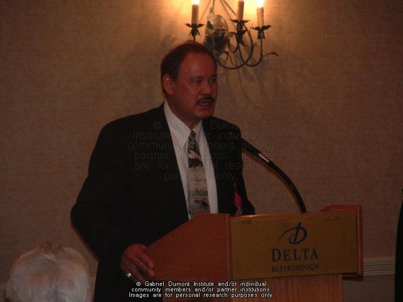 | Description: | Photograph of Bruce Dumont, President of the Métis Nation British Columbia, speaking at the Michif Speakers Conference, March 11, 2006, Saskatoon, Saskatchewan. Delegates from Saskatchewan, Alberta and Manitoba gathered to form the National Michif Speakers Association (NMSA), which consists of Michif-speaking community people dedicated to the protection and promotion of the Michif-Cree language. |