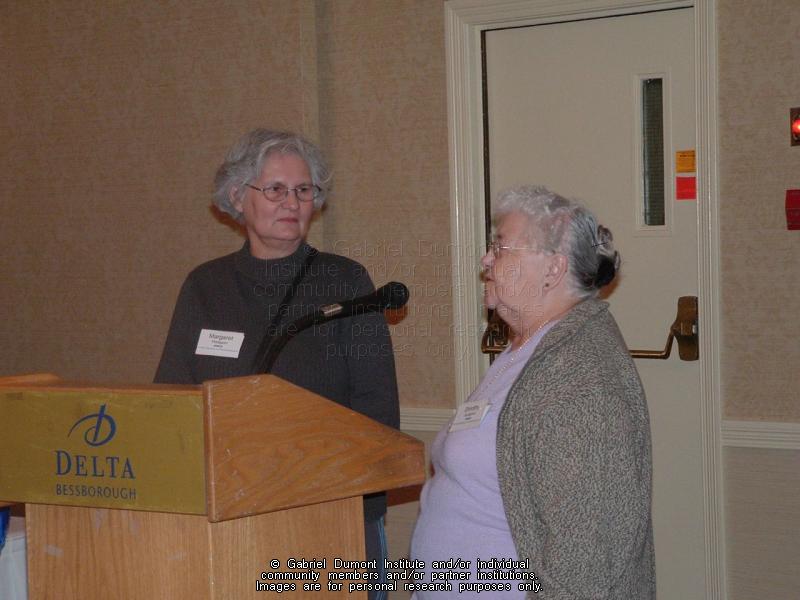 Description: Photograph of Margaret Hodgson (left) and Dorothy Aubichon (right), Michif speakers from Saskatoon, Saskatchewan, speaking at the Michif Speakers Conference, March 11, 2006, Saskatoon, Saskatchewan. Delegates from Saskatchewan, Alberta and Manitoba gathered to form the National Michif Speakers Association (NMSA), which consists of Michif-speaking community people dedicated to the protection and promotion of the Michif-Cree language.