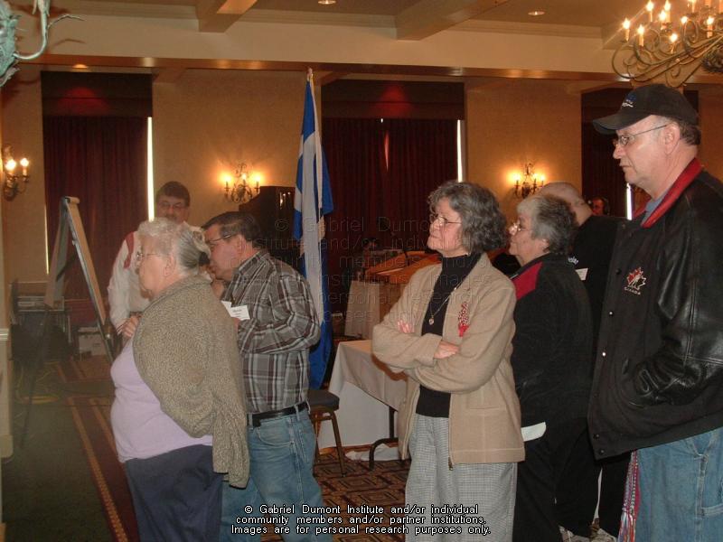 Photograph of participants reviewing strategies to preserve the Michif language at the Michif Speakers Conference, March 11, 2006, Saskatoon, Saskatchewan. From left to right: Dorothy Aubichon, Michif speaker from Saskatoon, Saskatchewan, Norman Fleury, Michif speaker from Virden, Manitoba, Mervin Fleury, Michif speaker from Roblin, Manitoba, Rita Flammand, Michif speaker from Camperville, Manitoba, Noella LeBlanc, Michif speaker from Birch River, Manitoba, George Pelletier (standing behind Noella LeBlanc), Michif speaker from Brandon, Manitoba, and Fred LaVallee, Michif speaker from Duck Bay, Manitoba. Delegates from Saskatchewan, Alberta and Manitoba gathered to form the National Michif Speakers Association (NMSA), which consists of Michif-speaking community people dedicated to the protection and promotion of the Michif-Cree language. |
