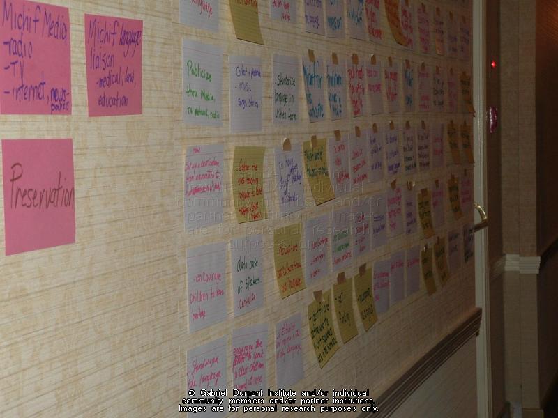 Photograph of strategies to preserve the Michif language. Delegates from Saskatchewan, Alberta and Manitoba gathered to form the National Michif Speakers Association (NMSA), which consists of Michif-speaking community people dedicated to the protection and promotion of the Michif-Cree language. |