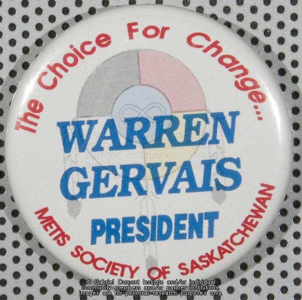 | Description: | "The Choice for Change: Warren Gervais for President" Métis Society of Saskatchewan election button. |