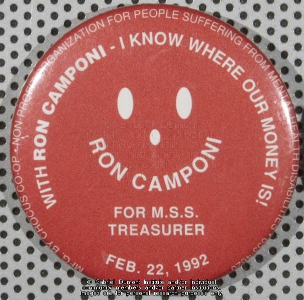 | Description: | Ron Camponi for Métis Society of Saskatchewan Treasurer election button. |